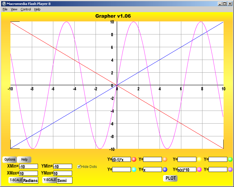 ![]() | Grapher is designed to display up to eight graphs at the same time. The graphs are generated from formulae entered into text entry boxes at the bottom of the window. |