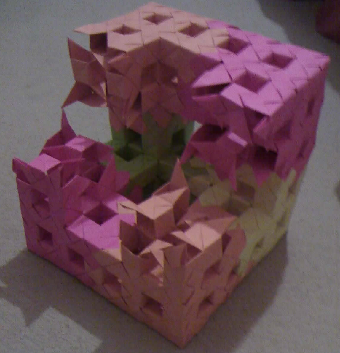 One of my previous projects involved the use of 1152 squares of paper to build a Level 2 Variant 12 Menger Sponge. In this case, there were 4 colours of brightly coloured post-it notes. It is currently 100% complete.