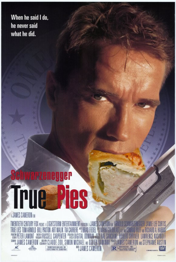 The original plot involved Arnold Schwarzenegger as Harry Tasker, an agent for the United States Counter-Pastie agency who does not tell his family what he really does when he is at work. They think he is a mild mannered baker. One day, while his wife is performing lewd acts for his entertainment, some pastie sympathizers kidnap them and take them to an island off the coast of Florida. Harry has no choice but to reveal his true job, and wipe them out before the bad guys can make a pastie large enough to wipe out Disneyland. The final cut replaced the pasties with nuclear weapons, since pasties are too scary and the film would have been X-rated.
